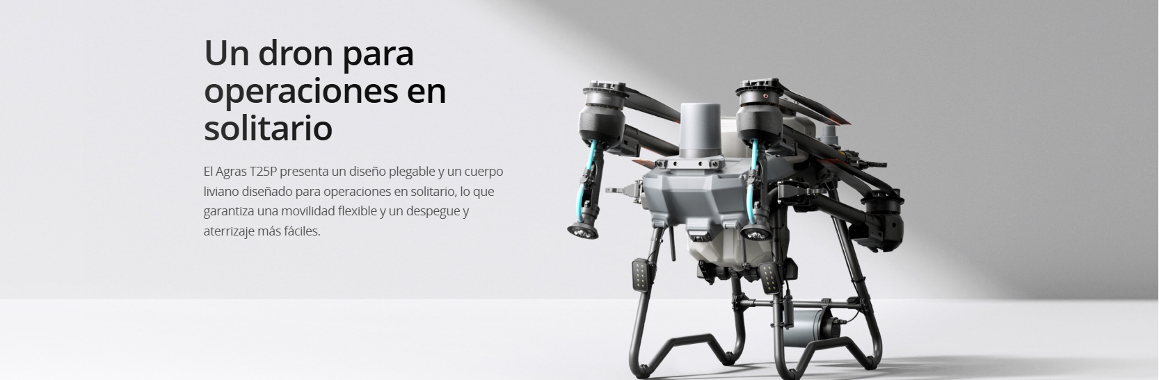 El dron DJI Agras T25P conserva su diseño compacto y plegable, con capacidad de pulverización de 20 kg , un sistema de distribución con alimentador de tornillo de alta precisión mejorado de 25 kg y el Sistema de Seguridad 3.0. Destaca en mapeo aéreo y protección de plantas, ofreciendo operaciones flexibles y una movilidad práctica, lo que lo hace ideal para operaciones en solitario