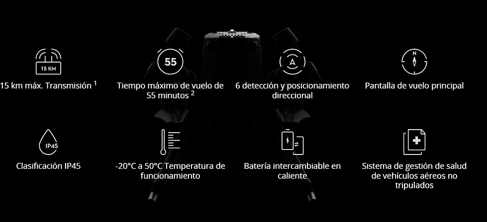 Para mejorar la seguridad en vuelo y la estabilidad de la aeronave, aparecen sensores ToF y de visión dual en los seis lados de la aeronave, que ofrecen un rango de detección máximo de hasta 40 m, con opciones para personalizar el comportamiento de detección de la aeronave a través de la aplicación DJI Pilot. Incluso en entornos operativos complejos, este sistema de posicionamiento y detección de 6 direcciones ayuda a mantener la aeronave y la misión seguras.